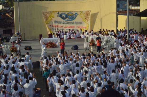 O I Congresso Eucarístico Diocesano aconteceu entre os dias 02 e 04 de agosto de 2018, na Quadra de Esportes da Escola de Aplicação Professor Chaves, em Nazaré da Mata-PE. Cerca de 400 pessoas – entre padres, diáconos, seminaristas, religiosos e religiosas, leigos e leigas de toda a Diocese – participaram do encontro, que teve como tema: “Eucaristia: Vida e Missão” e lema: “Eles o reconheceram no partir do pão” (Lc 24,35). O Assessor do Congresso foi o bispo diocesano de Palmares (PE), Dom Henrique Soares. Também marcaram presença os bispos Dom José Luiz Ferreira Salles (Diocese de Pesqueira) e Dom Limacêdo Antônio (Auxiliar de Olinda e Recife).