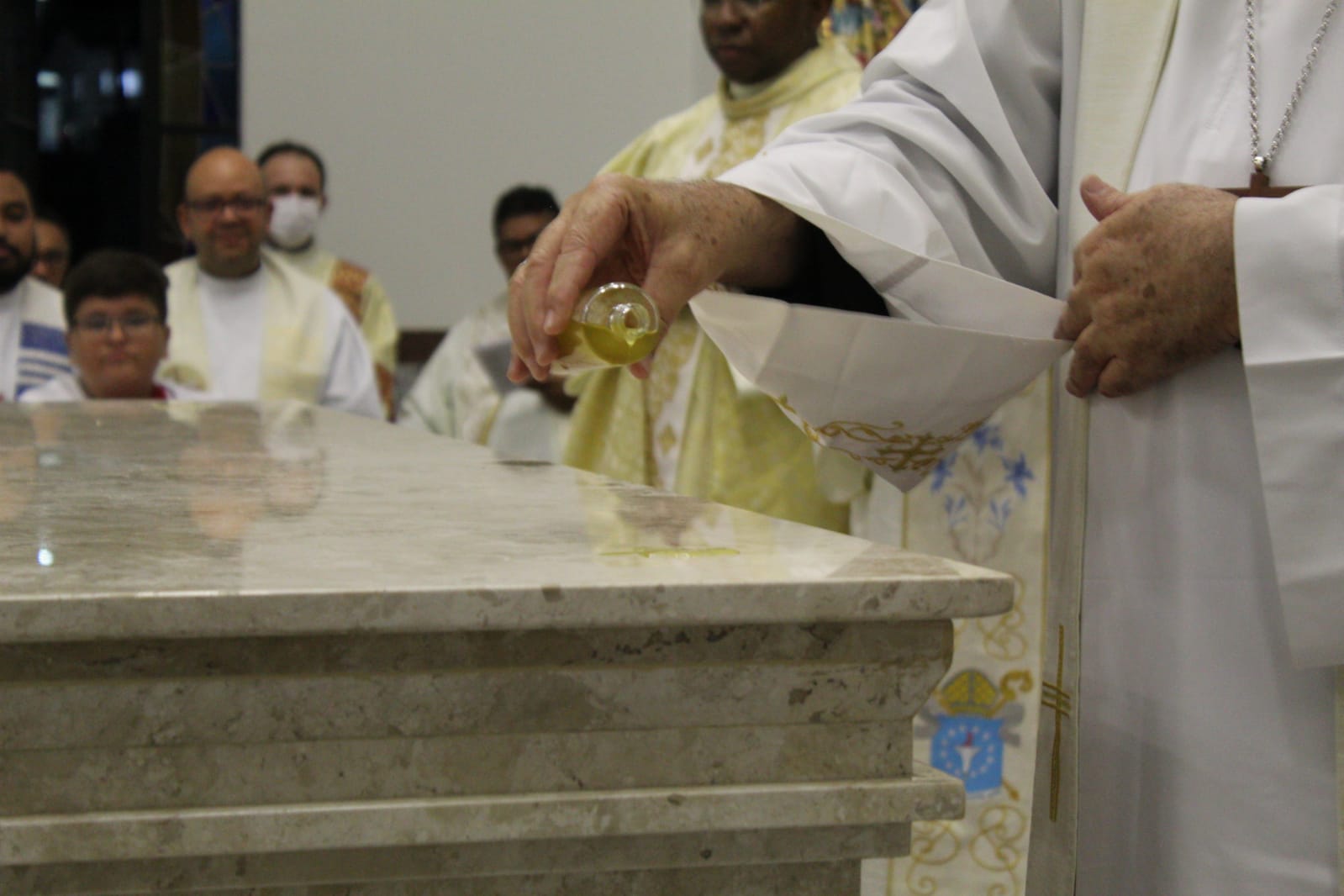 – Unção: unge-se o altar com o óleo do santo crisma. A Igreja recorda que Cristo é, ao mesmo tempo, sacerdote, altar e cordeiro que, continuamente, se oferece ao Pai em favor da salvação de toda a humanidade. Também foram ungidas as doze cruzes das paredes, construídas como colunas sagradas, que lembram que Cristo é o verdadeiro fundamento e alicerce da Igreja.