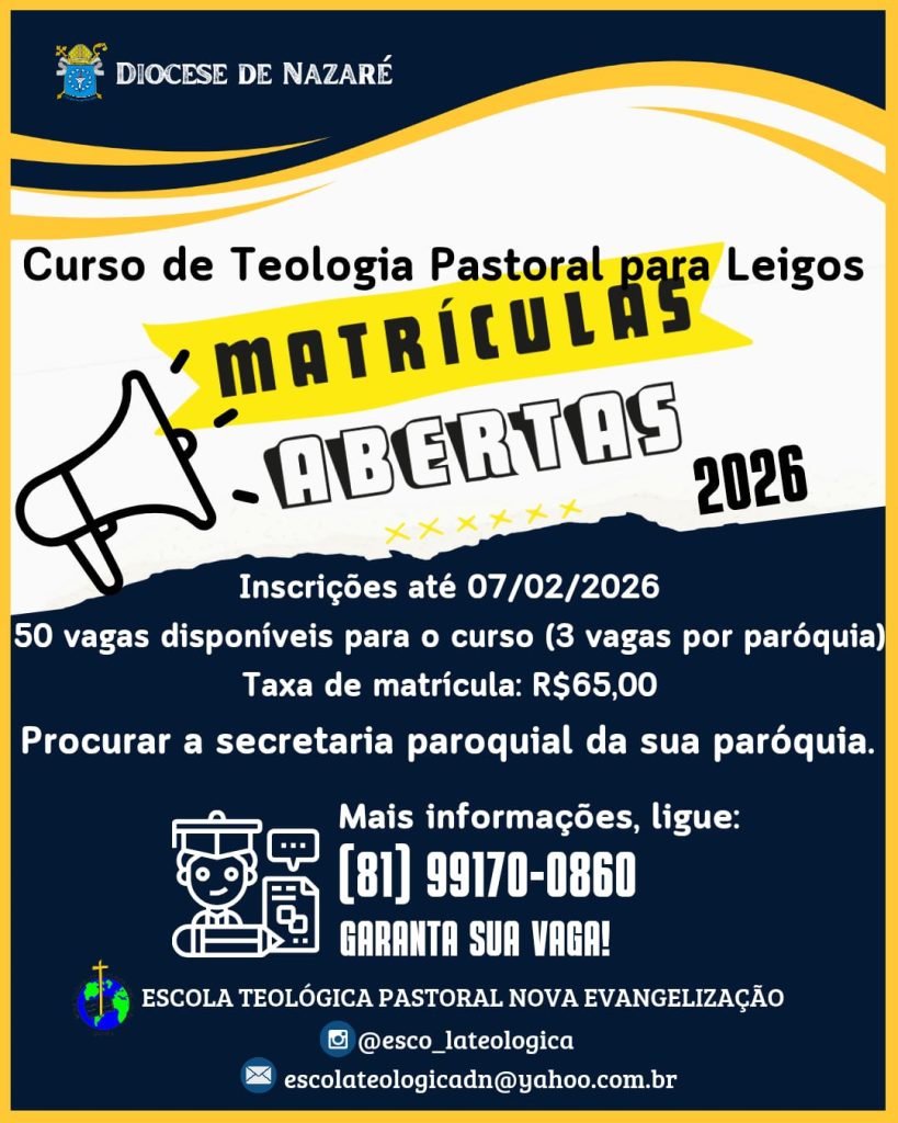 - Inscrições Teologia Pastoral: Até 07/02/2026 nas secretarias paroquiais.
