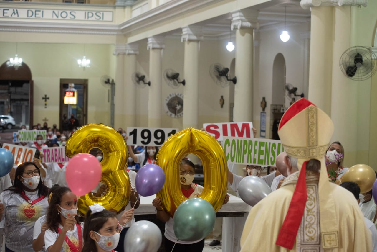 Foi realizada, ainda, uma breve apresentação que falava de seu chamado e de sua resposta ao Senhor “para uma grande missão”. Música, cartazes e a entrada de crianças com bolas de sopro marcaram esse momento especial. Por fim, o bolo de aniversário e o canto dos parabéns concluíram as homenagens a Dom Francisco Lucena pelos seus 30 anos de ordenação sacerdotal.