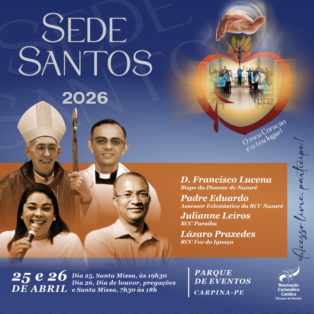A Renovação Carismática Católica (RCC) da Diocese de Nazaré realiza, no último final de semana de abril, dias 25 e 26, o “Sede Santos”. O evento ocorrerá no Parque de Eventos de Carpina e contará com uma programação que inclui momentos de louvor, adoração, pregações e celebração eucarística.