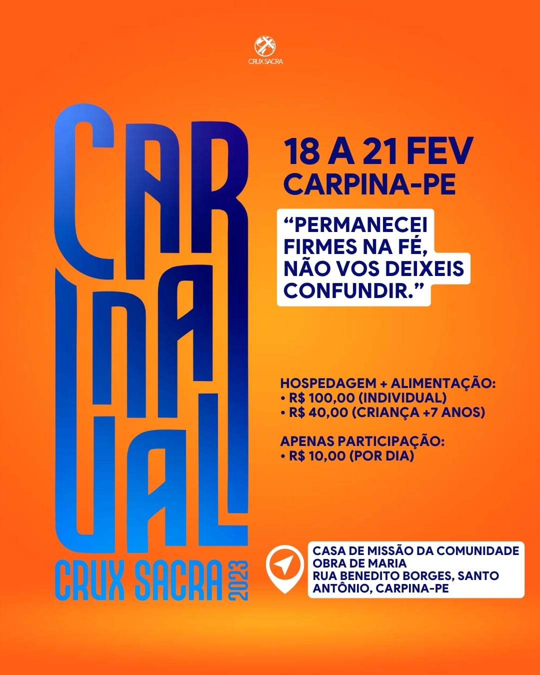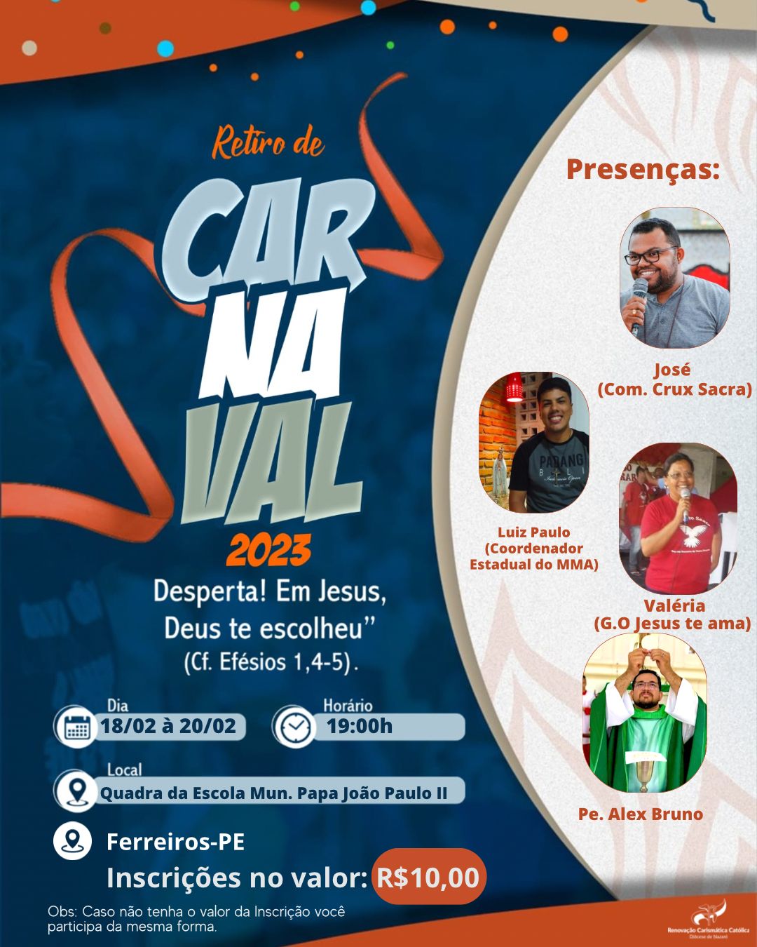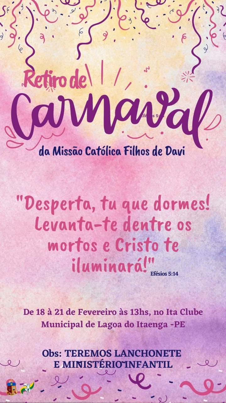 Retiros espirituais são sempre uma alternativa para quem deseja curtir o período carnavalesco de uma maneira diferente. Ao contrário da monotonia que muitos imaginam, esses eventos contam com uma programação bastante diversificada para todos os públicos: momentos de louvor, oração, adoração, pregações, missas, confissões, apresentações, shows musicais, baile a fantasia, retiro para crianças, dentre outras atividades. O objetivo é proporcionar uma experiência com Deus e preparar para o início do Tempo Quaresmal.