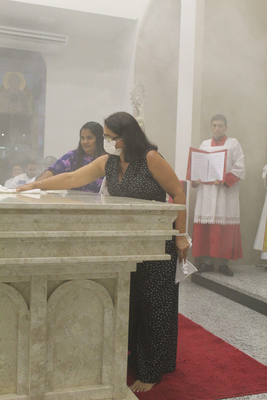 – Unção: unge-se o altar com o óleo do santo crisma. A Igreja recorda que Cristo é, ao mesmo tempo, sacerdote, altar e cordeiro que, continuamente, se oferece ao Pai em favor da salvação de toda a humanidade. Também foram ungidas as doze cruzes das paredes, construídas como colunas sagradas, que lembram que Cristo é o verdadeiro fundamento e alicerce da Igreja.