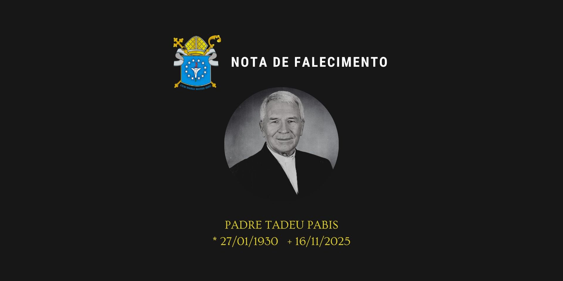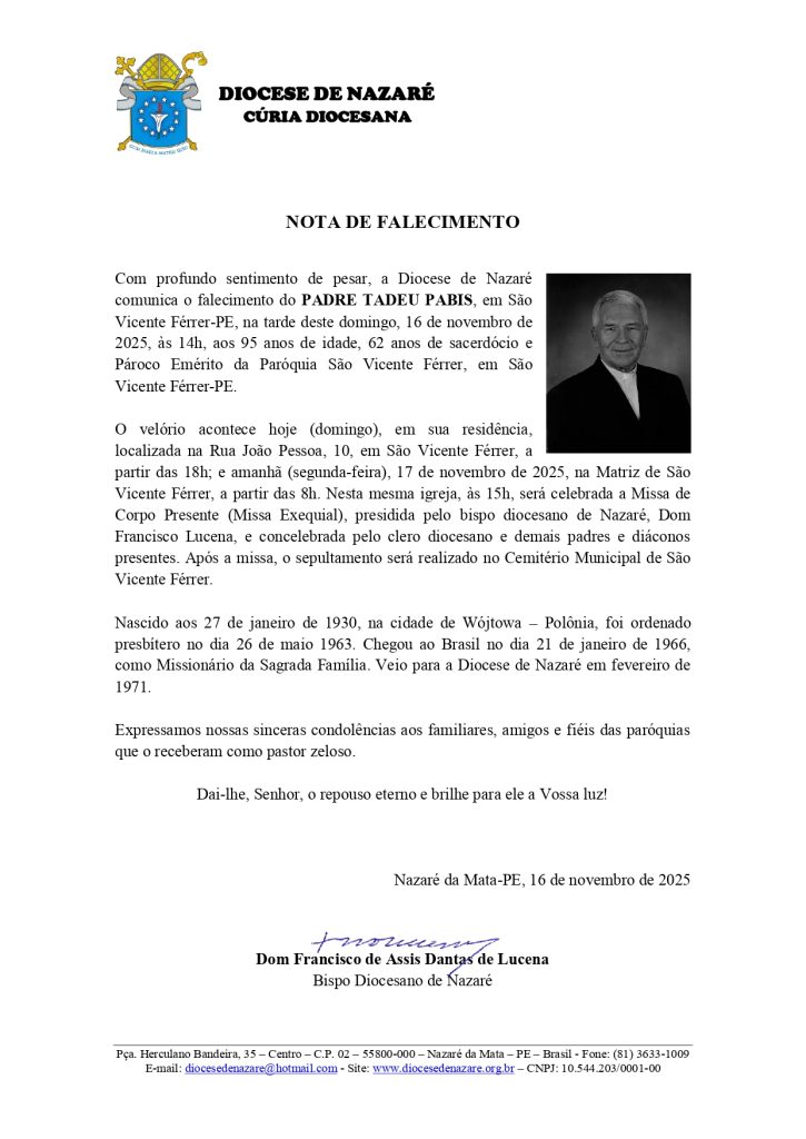 nov162025Sem categoria Baixe a Nota de Falecimento em PDF aqui! Category: Sem categoriaPor Diocese de Nazaré16 de novembro de 2025 Compartilhar esta postagem TweetShare on Twitter Share on WhatsAppShare on WhatsApp Pin itShare on Pinterest Share on FacebookShare on Facebook Share on LinkedInShare on LinkedIn Navegação de post:AnteriorPost anterior:Confira Edital de Convocação para a Assembleia de Constituição da Cáritas Diocesana de NazaréMAIS ARTIGOSMuseu de Arte Sacra de Goiana: reunião fortalece aproximação entre Diocese de Nazaré e SESC/PE13 de novembro de 2025Neste mês missionário, Diocese de Nazaré promove reunião ampliada com clero e funcionários paroquiais14 de outubro de 2025Criação da paróquia e posse do primeiro pároco marcam celebração de Nossa Senhora do Rosário em Angélicas9 de outubro de 2025Reunião do clero: Assembleia Diocesana, Pastoral da Sobriedade e Mês Missionário entre as pautas deste mês de setembro8 de setembro de 2025“Família, Peregrina de Esperança”: Jubileu das Famílias reúne cerca de cinco mil pessoas em Carpina26 de agosto de 2025Criada a Área Pastoral Nossa Senhora Auxiliadora em Caueiras24 de agosto de 2025